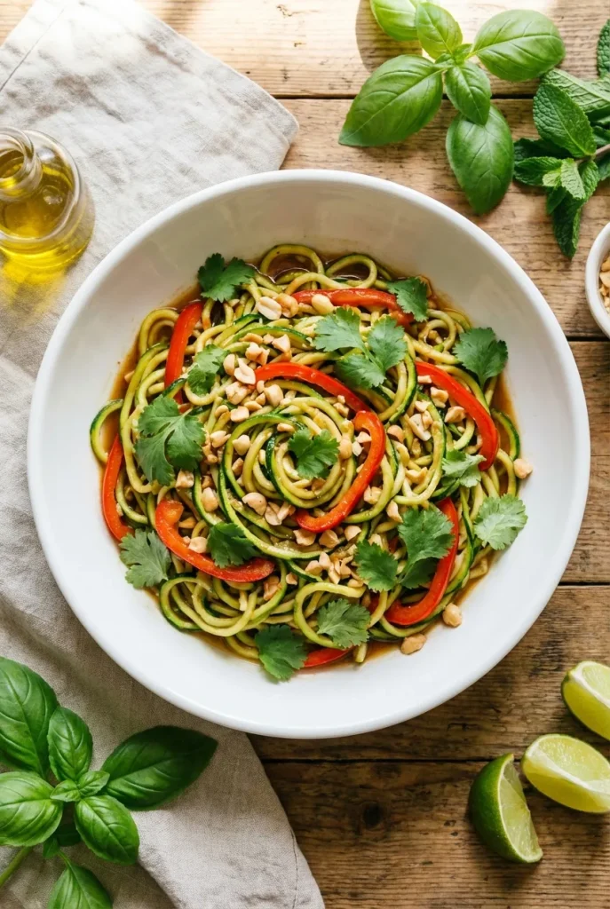 A healthy, low-carb take on classic Pad Thai, ready in under 30 minutes. This vegetarian dish features spiralized zucchini, a creamy peanut sauce, and fresh garnishes.
