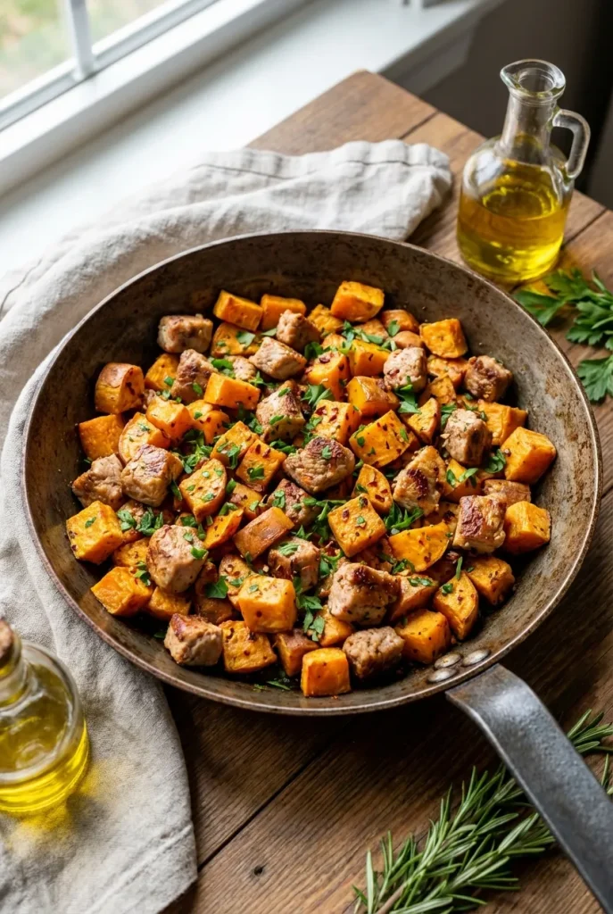 A one-pan turkey and sweet potato skillet with red onion and a hint of chili. Ready in 40 minutes, this high-protein, gluten-free meal is perfect for a healthy weeknight dinner.