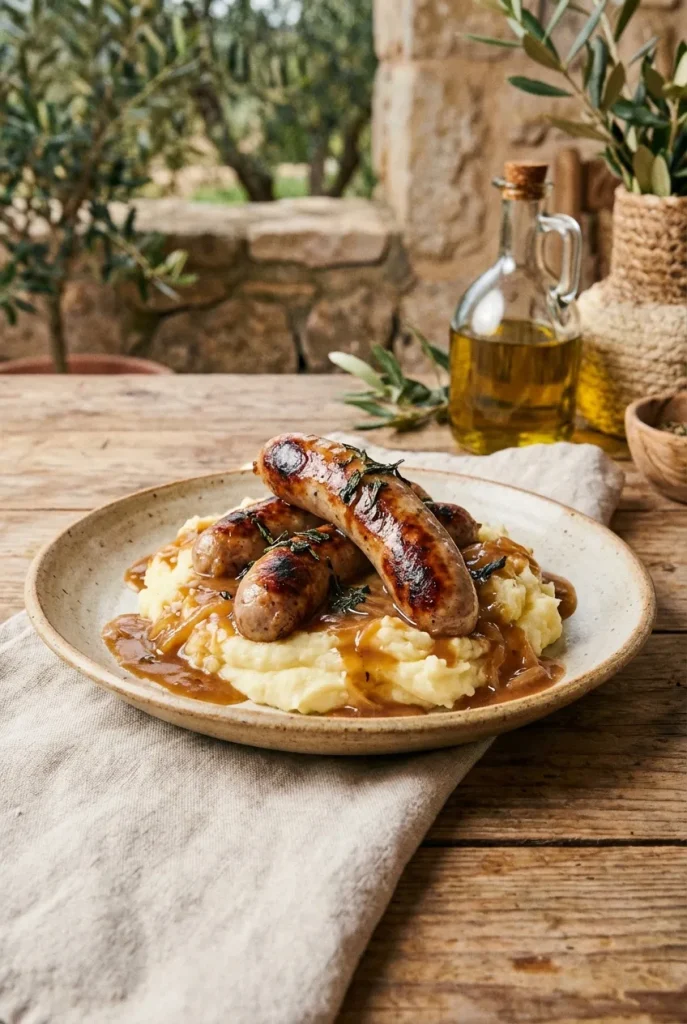 A comforting British classic featuring savory pork sausages over creamy mashed potatoes, all smothered in a rich, homemade onion gravy. A perfect, reliable weeknight dinner.