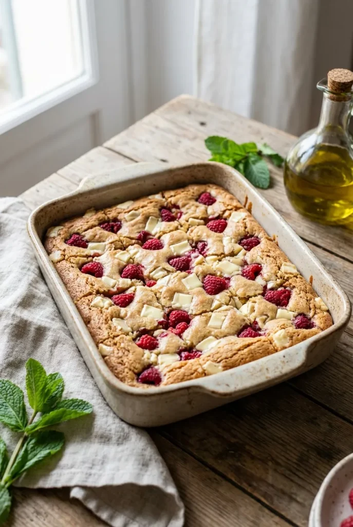 A deliciously easy recipe for chewy blondies packed with tart fresh raspberries and creamy white chocolate chunks. Perfect for a quick and impressive dessert.