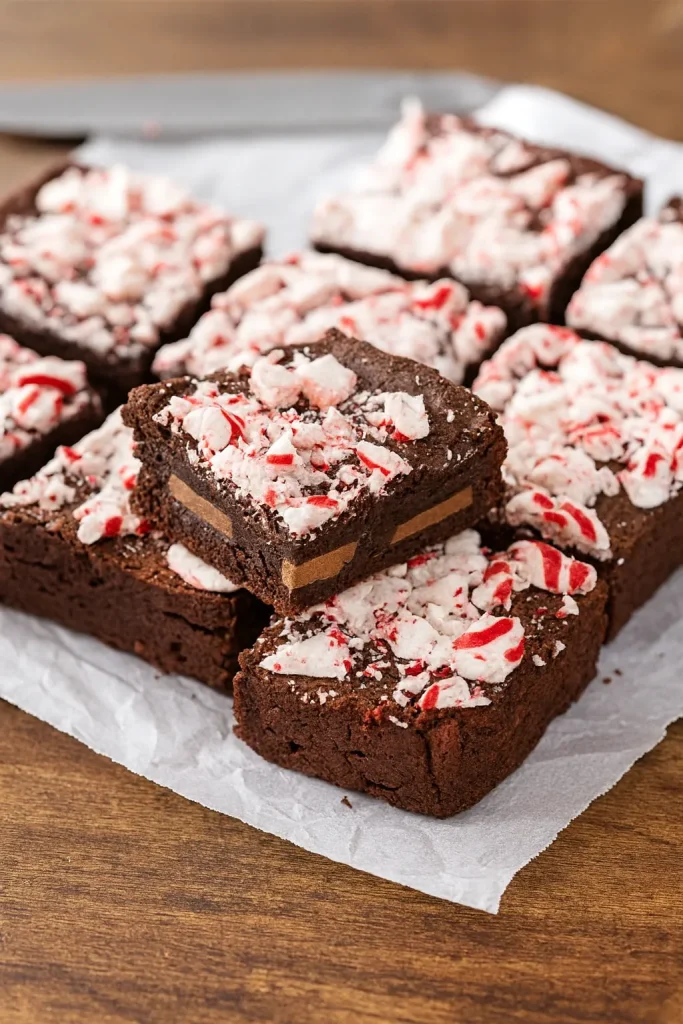 Rich, fudgy peppermint brownies packed with dark chocolate chips and topped with a crunchy layer of crushed peppermint candies. An easy, decadent dessert perfect for holiday baking.