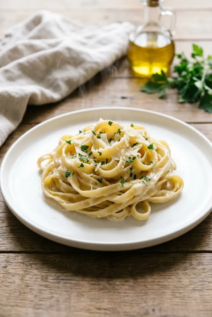 A healthier take on classic Fettuccine Alfredo, made creamy with a simple milk-based sauce instead of heavy cream. Ready in 30 minutes for an easy weeknight dinner.