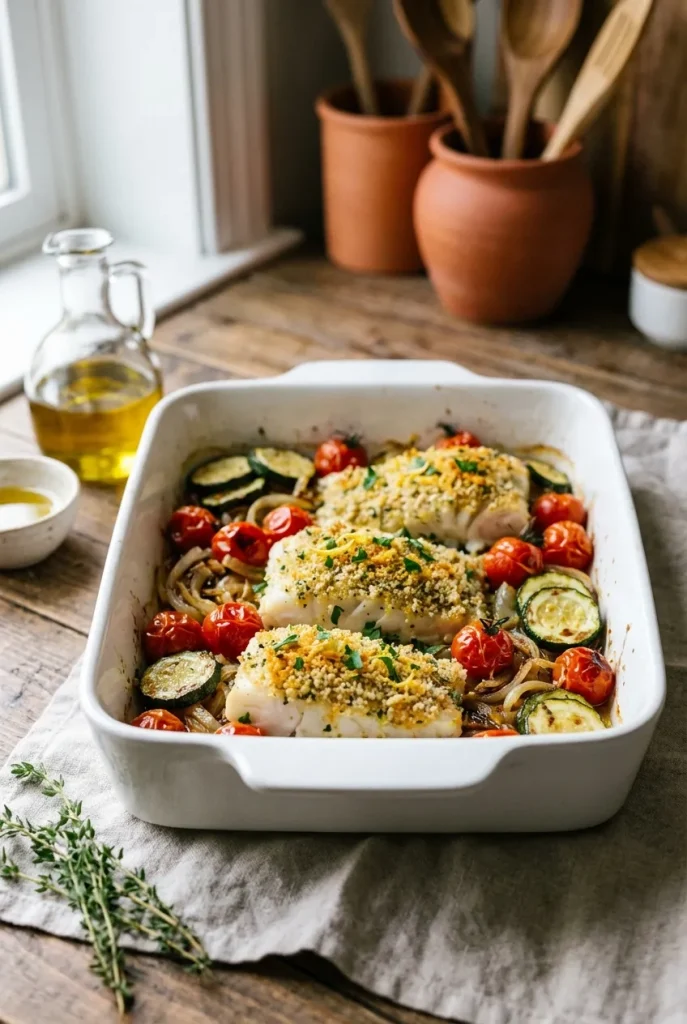 This Mediterranean Baked Cod is a 30-minute meal combining flaky fish, a zesty breadcrumb crust, and roasted vegetables. It’s an easy, healthy, and flavorful weeknight dinner.