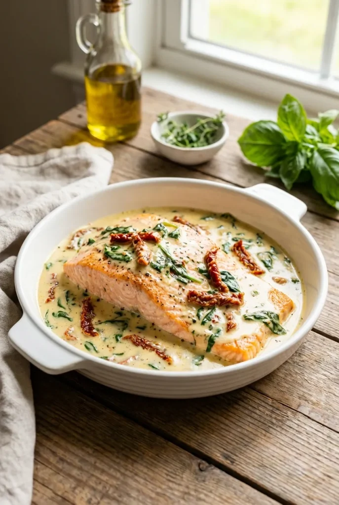 Perfectly seared salmon in a rich, creamy sauce with sun-dried tomatoes and spinach. This elegant Tuscan salmon recipe comes together in just 30 minutes.
