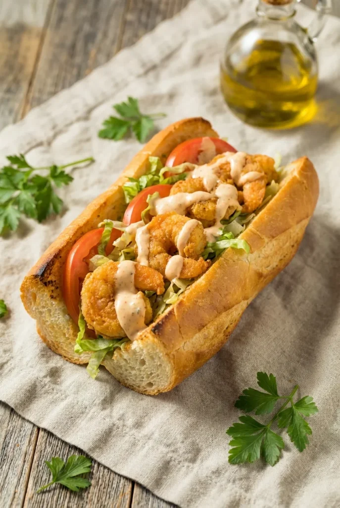 This classic Shrimp Po' Boy recipe delivers a taste of the South with crispy fried shrimp, fresh lettuce and tomato, and a zesty remoulade sauce, all piled into a soft…