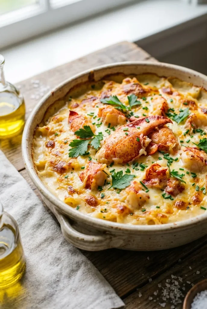 A rich and creamy baked lobster mac and cheese featuring a sharp cheddar and Gruyère sauce, tender lobster, and a crisp panko topping. Perfect for special occasions.