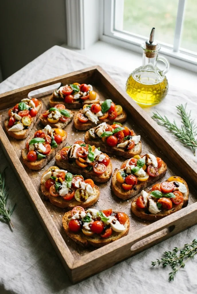 A classic Bruschetta Bar perfect for summer gatherings. Features crisp, garlic-rubbed bread with fresh tomato, basil, and mozzarella. Simple, fresh, and always a crowd-pleaser.