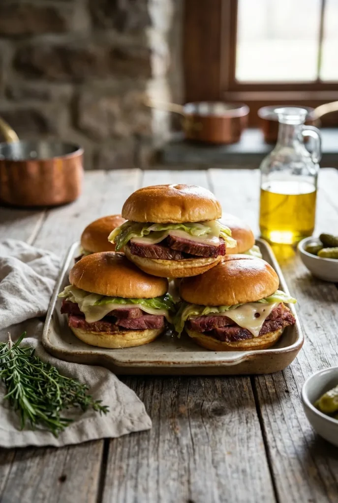 Tender, slow-roasted corned beef and crisp cabbage piled onto toasted slider buns. A perfect fusion comfort food for St. Patrick's Day or any weeknight.