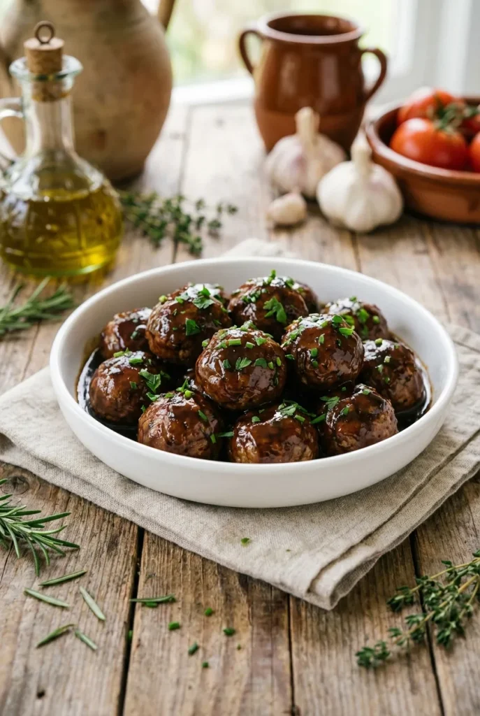 Tender beef meatballs are seared until golden, then simmered in a rich, savory-sweet glaze made from Guinness, brown sugar, and Dijon. A perfect cozy dinner.