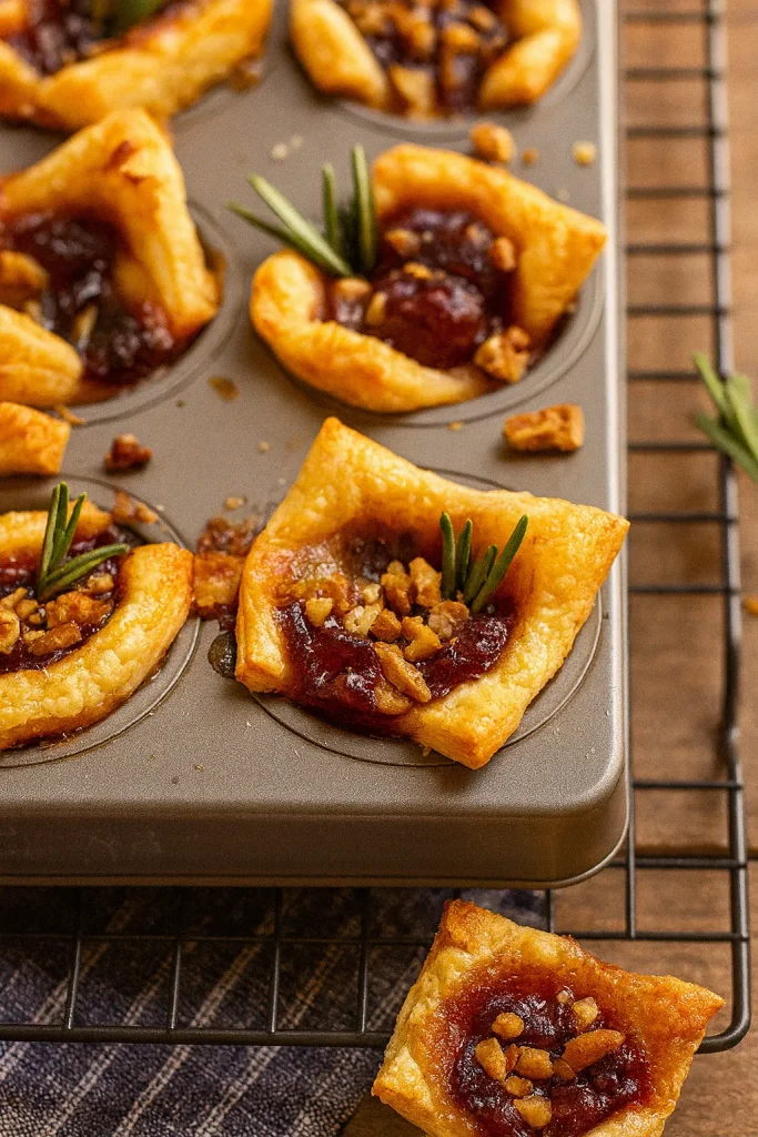 These Baked Cranberry Brie Bites are the perfect holiday appetizer. Creamy brie, tangy cranberry sauce, and fresh rosemary wrapped in flaky puff pastry.