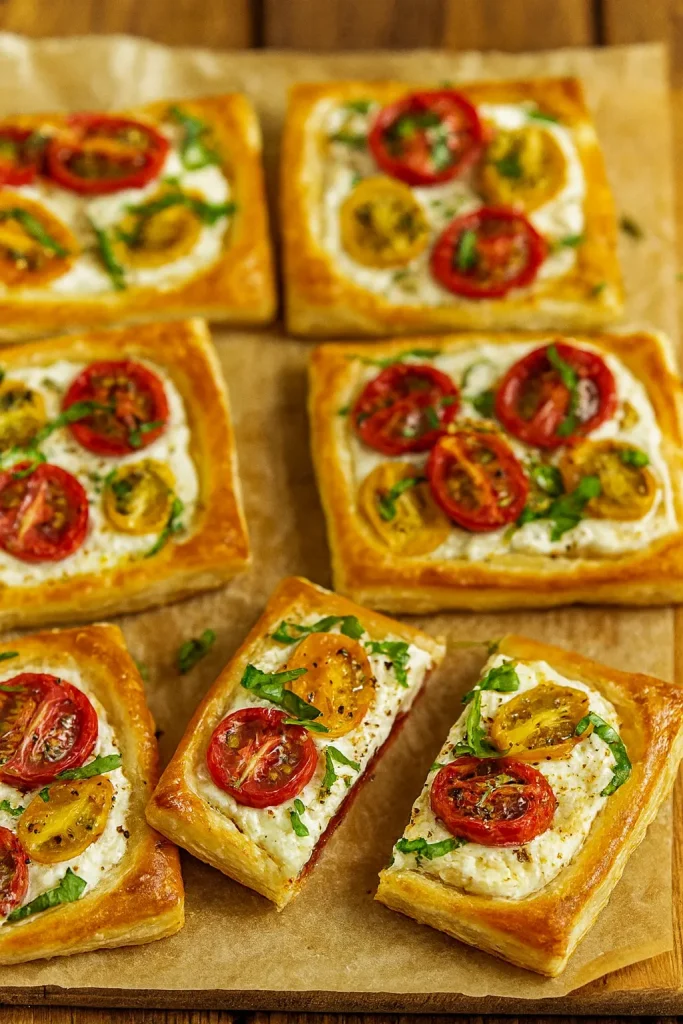 These simple and elegant tomato tartlets feature a creamy ricotta filling, juicy cherry tomatoes, and fresh basil on a flaky puff pastry crust. A perfect summer appetizer.