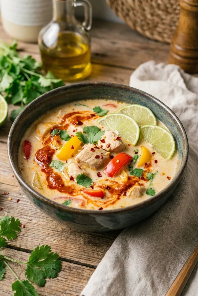 A rich and aromatic Thai Coconut Curry Soup with tender chicken and crisp bell peppers, ready in 40 minutes for a comforting weeknight dinner.