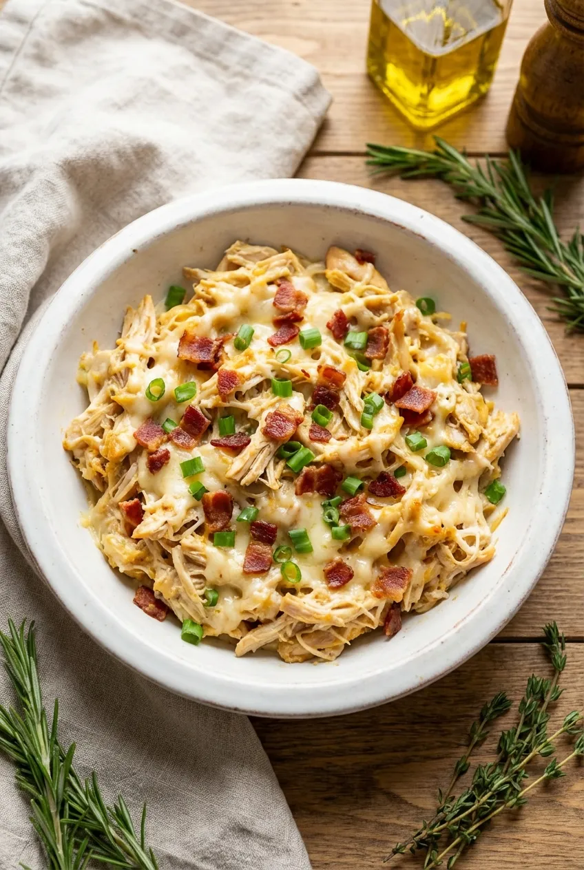 Tender shredded chicken cooked slowly in a creamy, cheesy ranch sauce with crispy bacon for a comforting low-carb dinner.