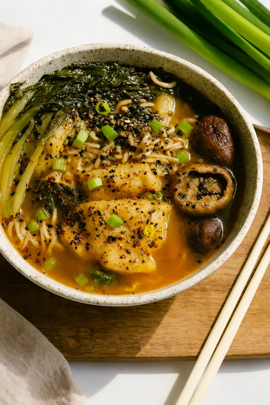 - Add sliced shiitake mushrooms and quartered bok choy to the simmering broth. Cook 5–7 minutes until mushrooms are tender and bok choy is wilted but crisp.