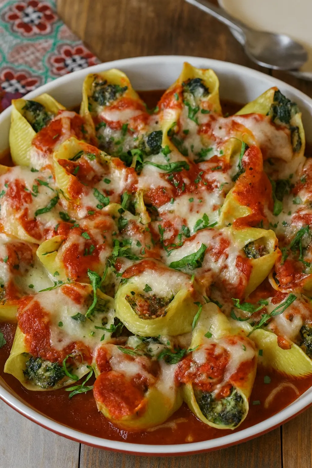Spread 1 cup of marinara sauce evenly over the bottom of a large baking dish (a 9×13-inch dish works well). This layer of sauce prevents the shells from sticking. Using a small spoon, gently fill each cooked pasta shell with the spinach and cheese mixture.