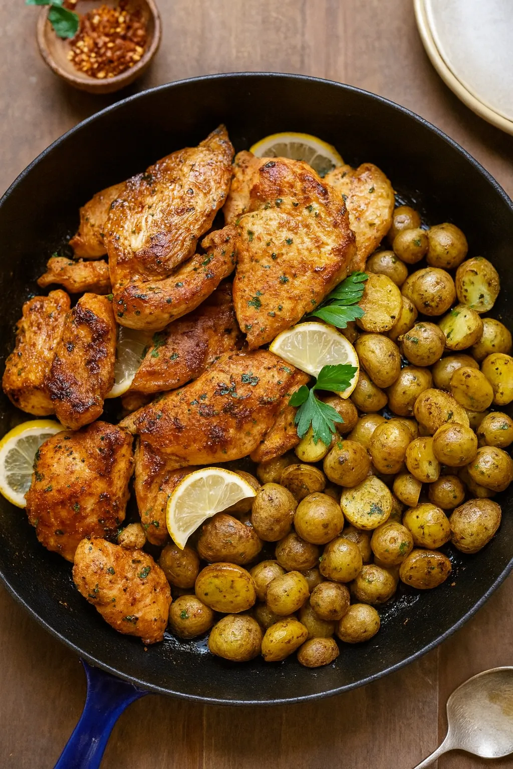Return the cooked chicken breasts to the skillet. Spoon the sauce generously over the chicken and potatoes. Allow everything to simmer together for 5 minutes, letting the chicken reheat and absorb the sauce. Garnish with freshly chopped parsley and serve immediately.