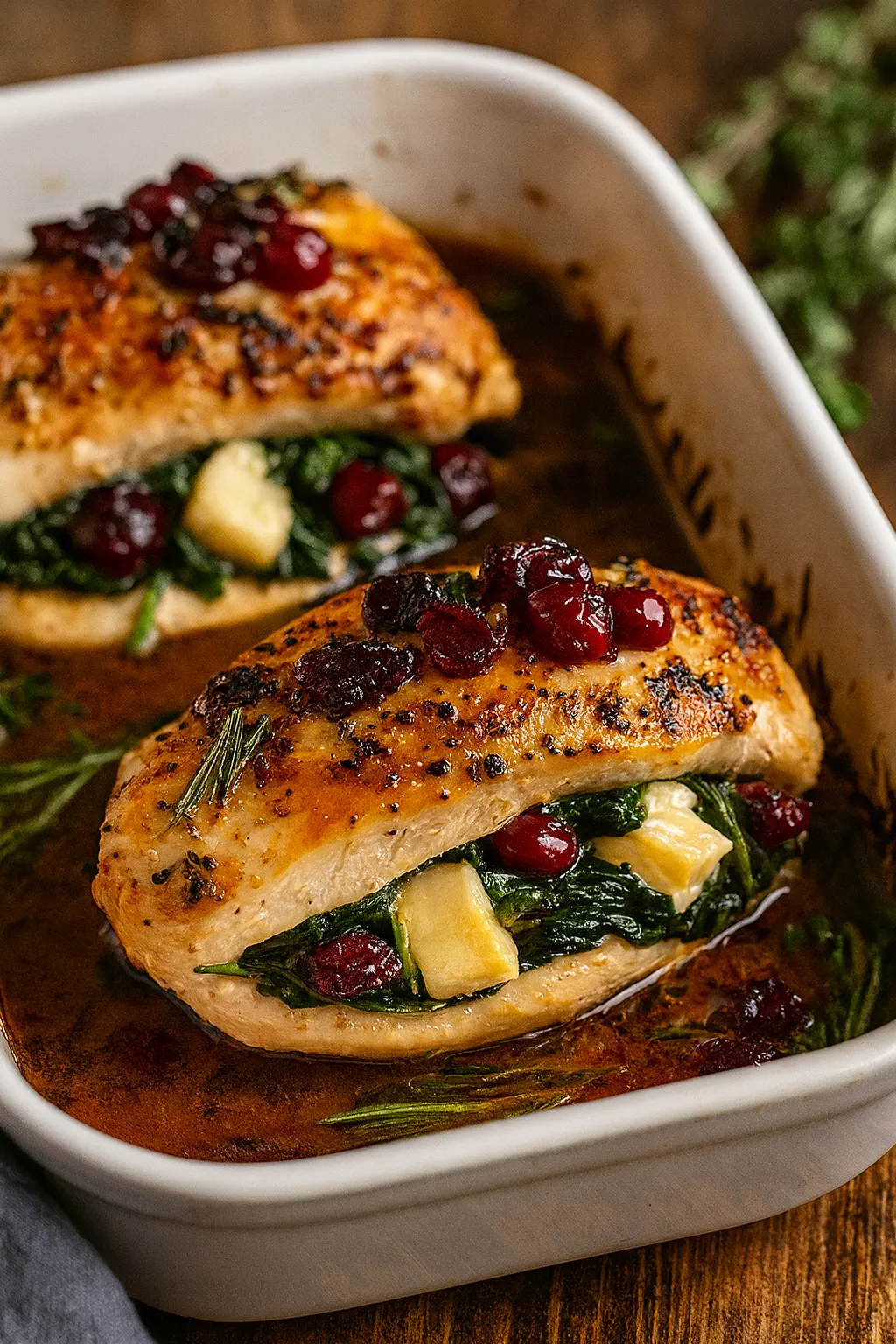This Cranberry Brie Stuffed Chicken is an elegant main course that’s perfect for holiday dinners or special occasions. It features tender chicken breasts filled with creamy melted Brie, tart dried cranberries, and fresh spinach for a restaurant-quality meal that’s surprisingly straightforward to make at home. It’s a complete flavor package—savory, sweet, and rich—that comes together in just 45 minutes.