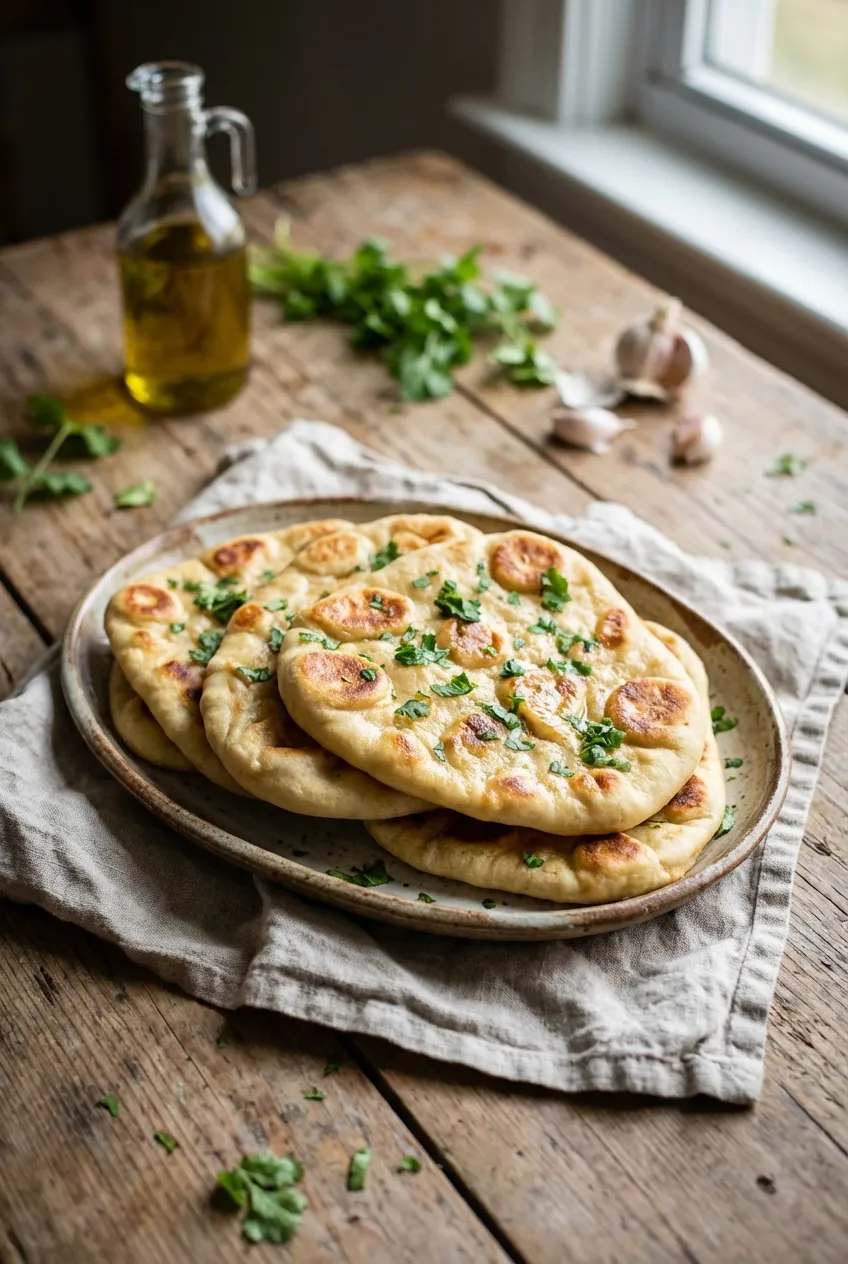 Tips: Use fresh parsley or mint instead of cilantro for a milder flavor. Sprinkle nigella or sesame seeds onto dough before cooking for extra texture. Brush cooked naan with melted butter or ghee instead of olive oil for richer flavor. Storage: Store leftover naan in an airtight container at room temperature for up to 2 days. Reheat: Warm in a hot, dry skillet for 30-60 seconds; avoid microwaving to prevent toughness.
