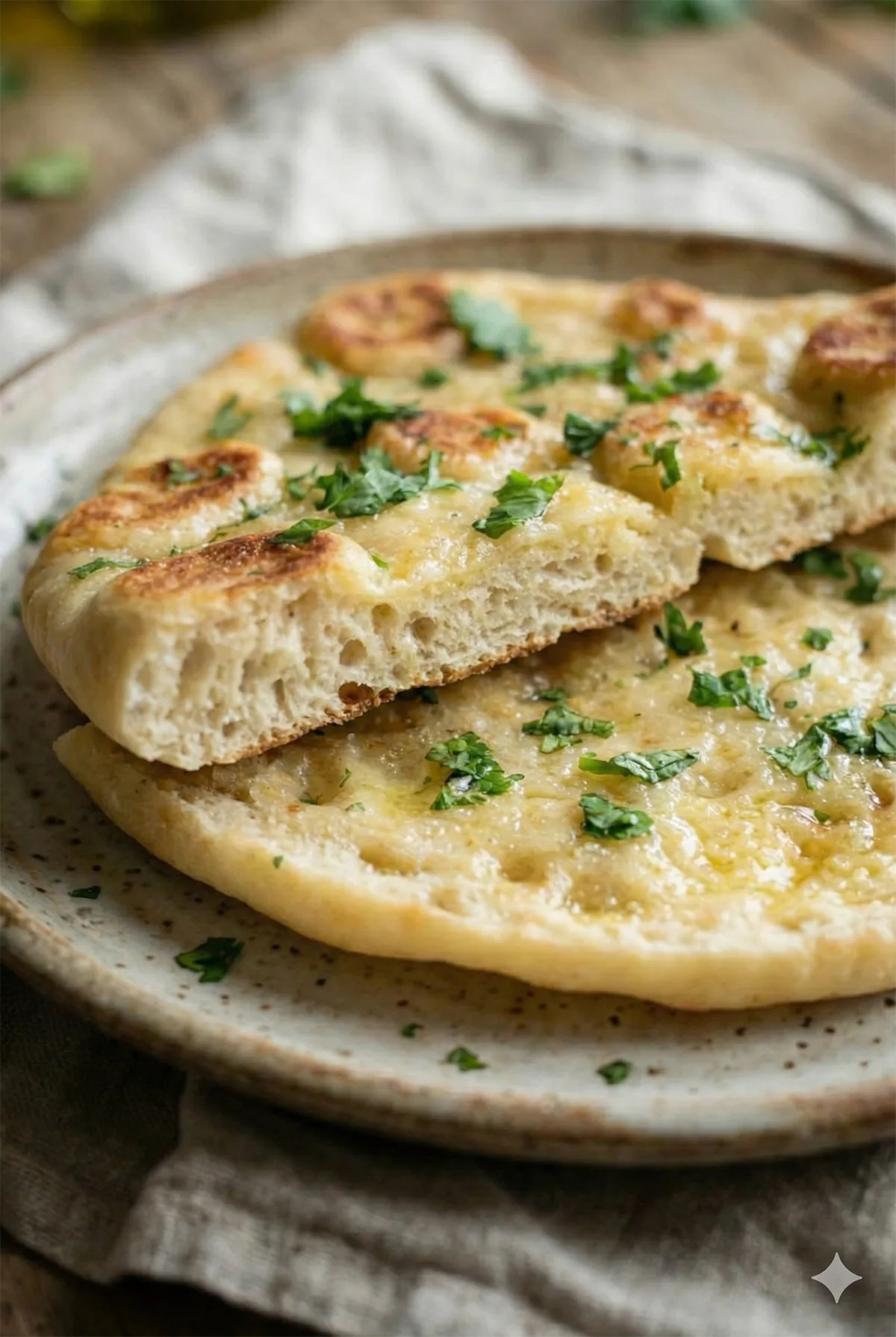 A stack of freshly cooked sourdough discard naan bread on a plate, garnished with cilantro.