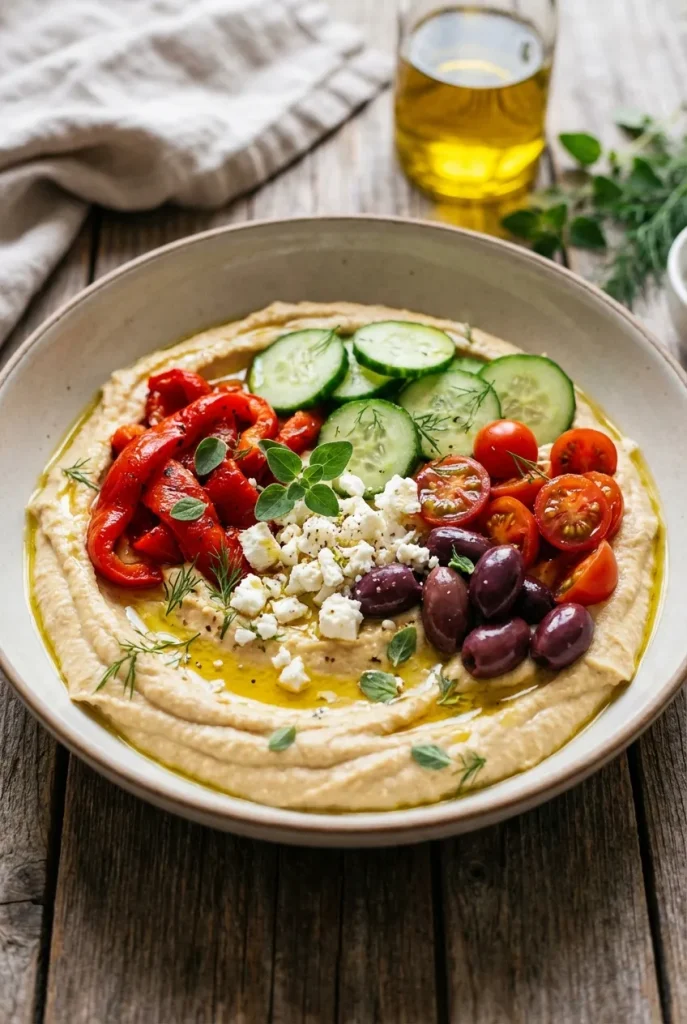 This Loaded Greek Hummus Bowl is a no-cook, 15-minute meal packed with fresh Mediterranean flavor. Creamy homemade hummus is topped with crisp cucumber, tomatoes, olives, and feta.