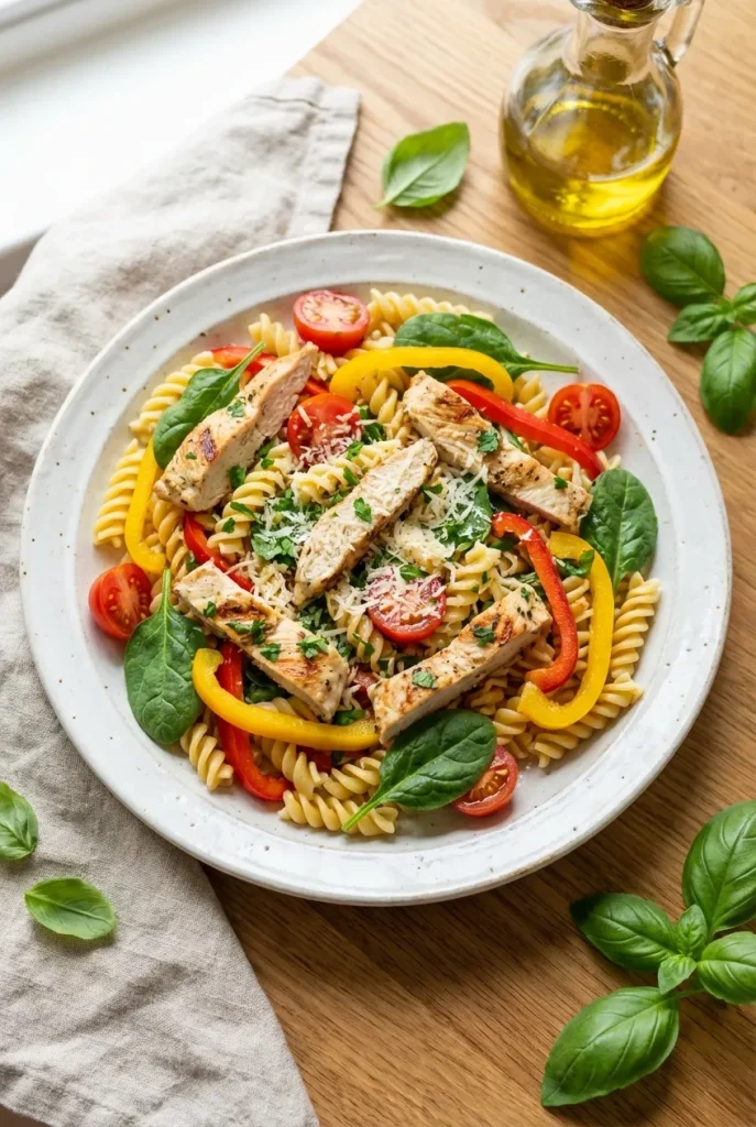 A vibrant, Mediterranean-inspired pasta salad packed with grilled chicken, fresh vegetables, and a zesty lemon dressing. Perfect for a healthy, satisfying meal prep lunch or light dinner.